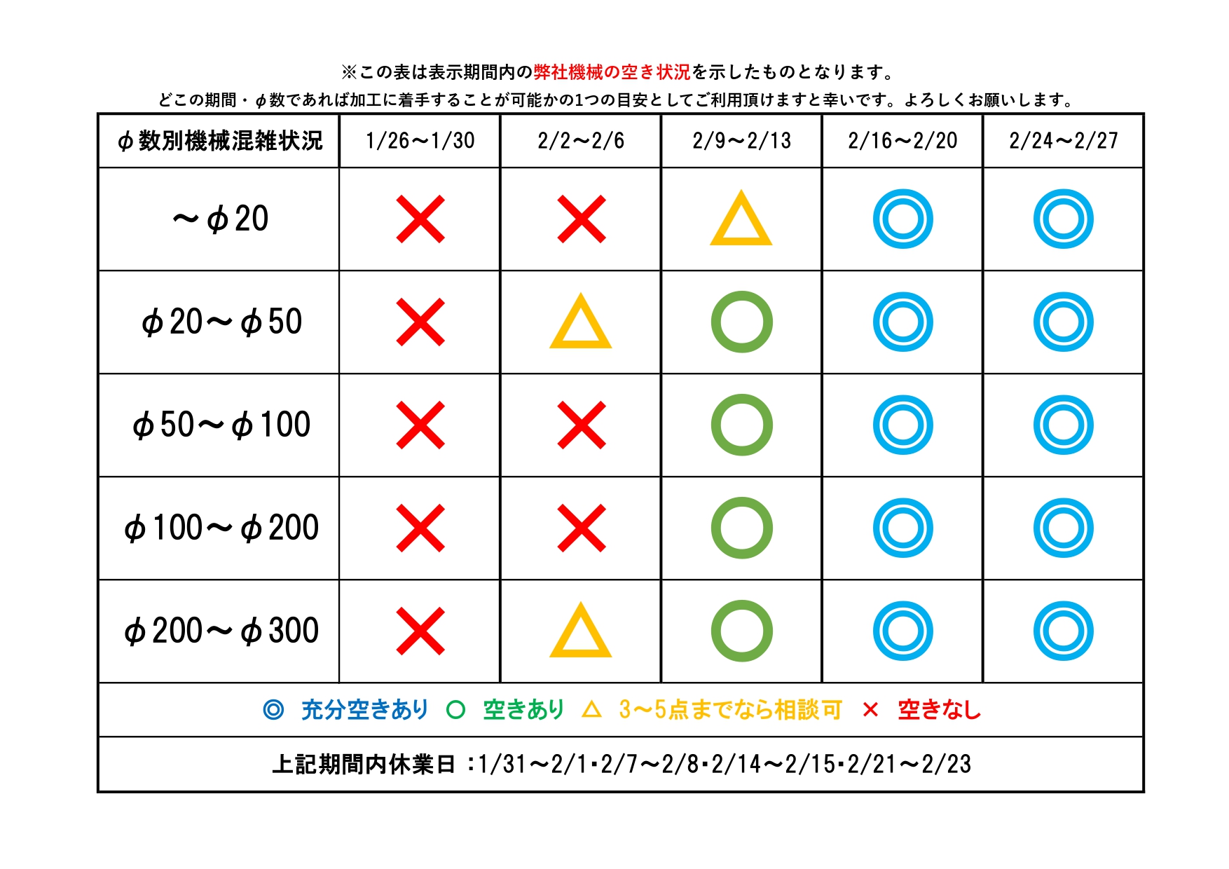 特にΦ20以下、Φ50~Φ200は加工スタートが2/9週からとなってしまいます。