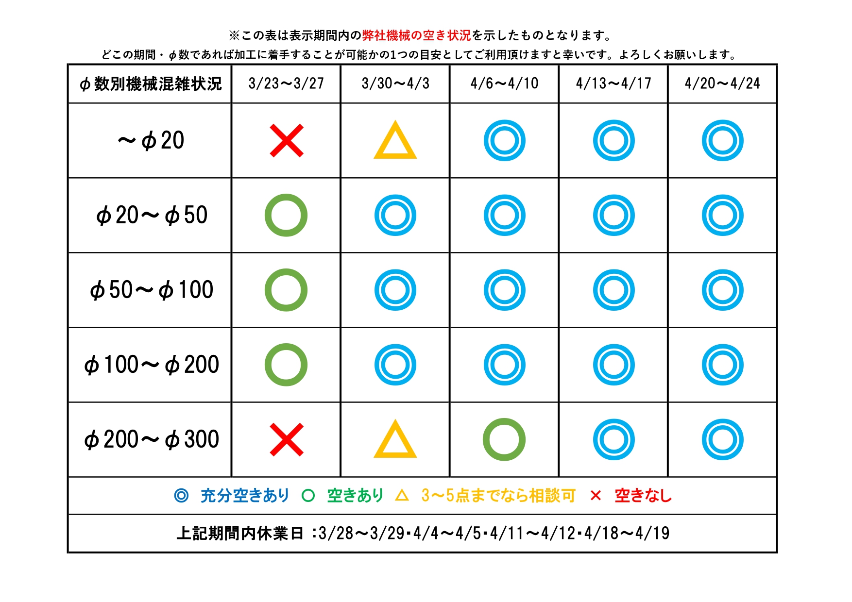 普段埋まりやすい~φ20、φ200~300の枠も、4月中旬納期であればご相談可能です!