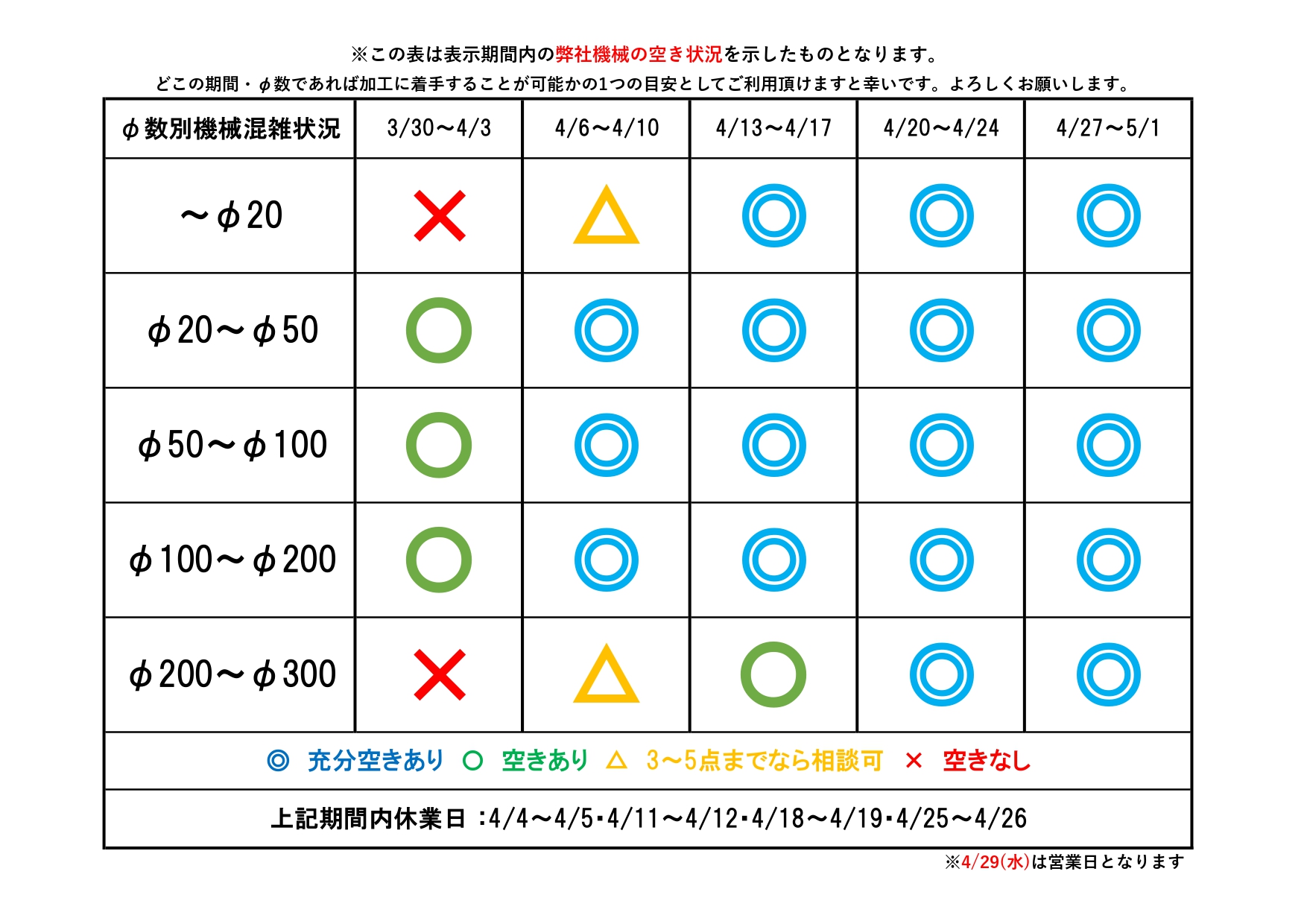 さて今回は、3/30~5/1の期間における機械の空き状況をお知らせします📢